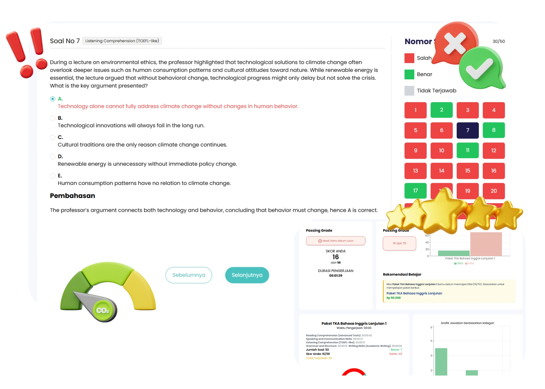 Sistem pengerjaan mengikuti alur CBT yang terstruktur, lengkap dengan pengaturan waktu dan navigasi soal, membantu Anda lebih siap menghadapi ujian berbasis komputer.